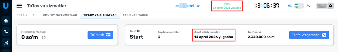 Sinov davri yakunlanish sanasi yoki tarif bo‘yicha qolgan kunlar sonini bilish uchun UTeL shaxsiy kabinetiga kiring. O‘chirilish sanasini ekraning yuqori o‘ng burchagida, shuningdek Profil / To‘lov va xizmatlar sahifasida ham ko'rishingiz mumkin.