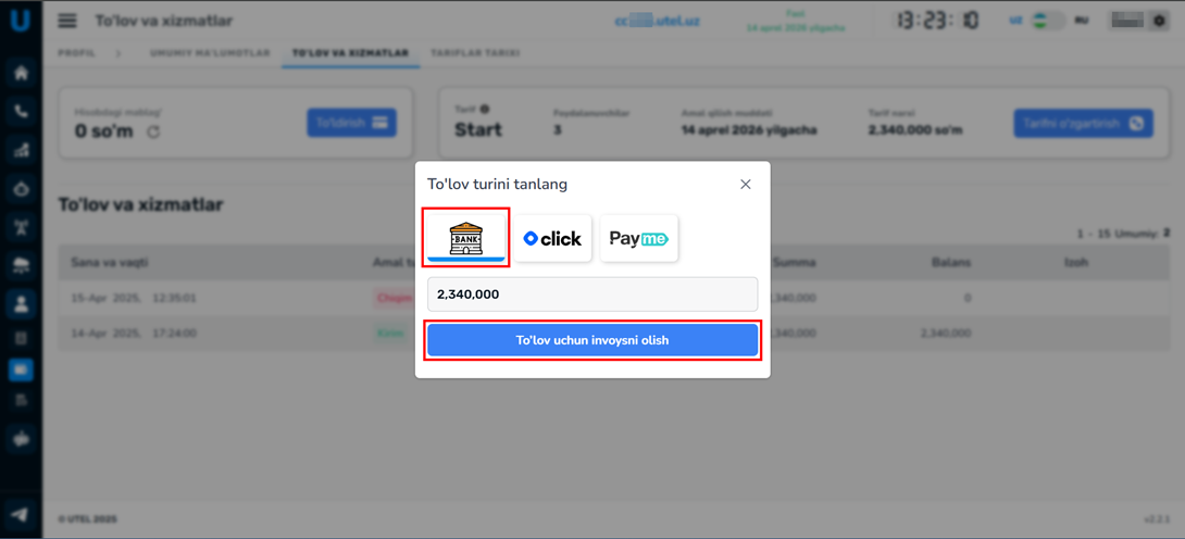 - Ochilgan oynada bank orqali to‘lov usulini tanlang va “To‘lov uchun invoysni olish” tugmasini bosing.