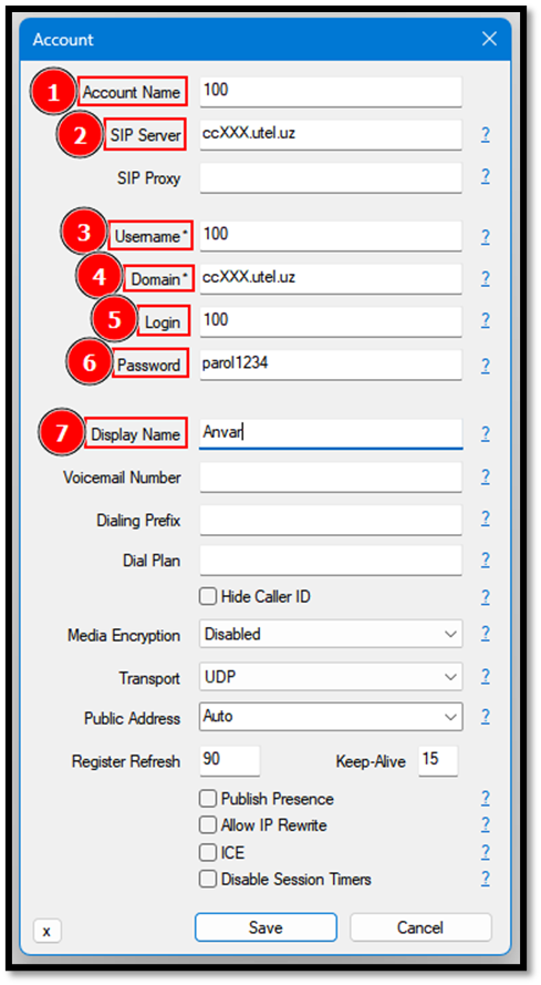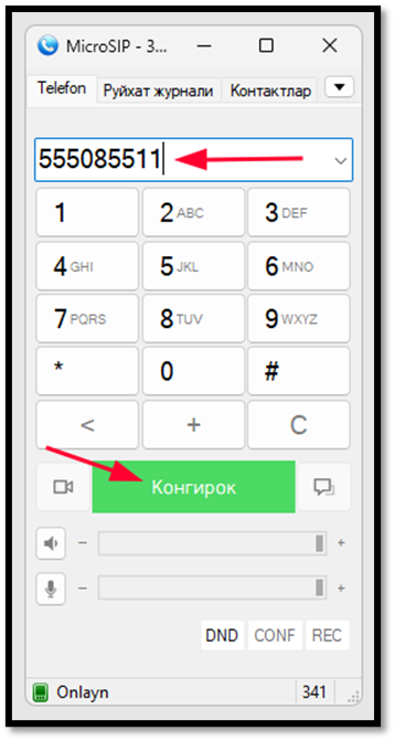 1) Operatorning ichki raqami(misol sifatida 100 ko’rsatilgan, operatorlarning ichki raqamlari kabinetda ko’rsatilgan bo’ladi).